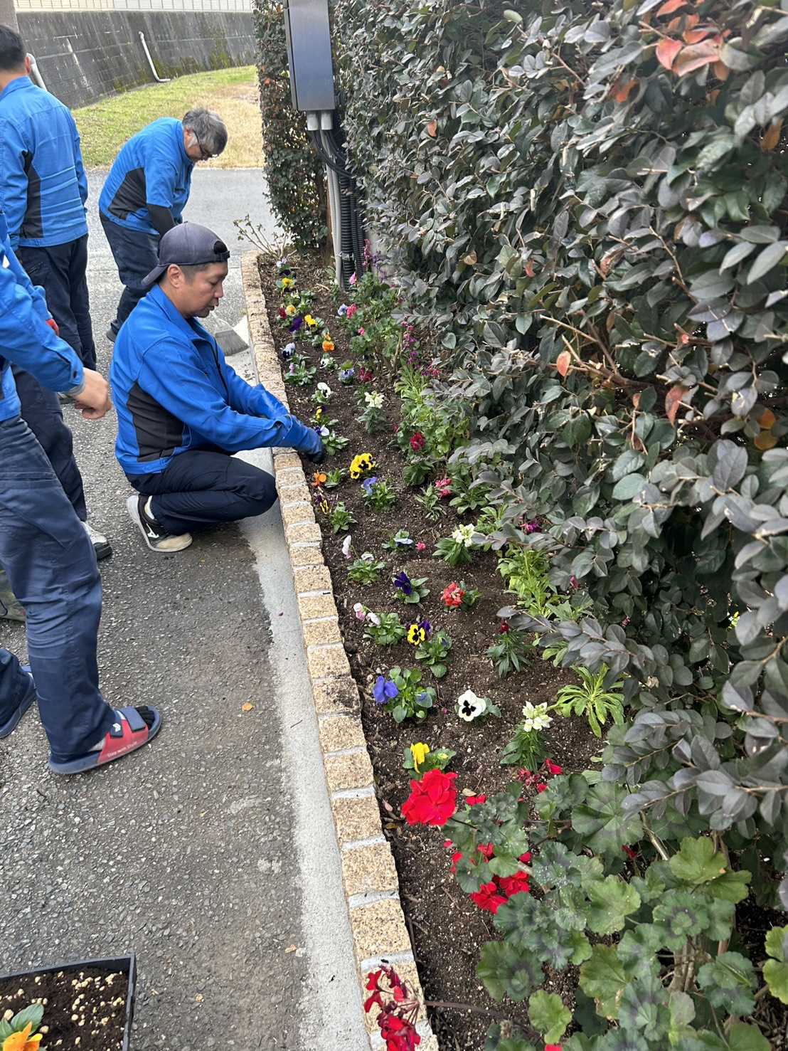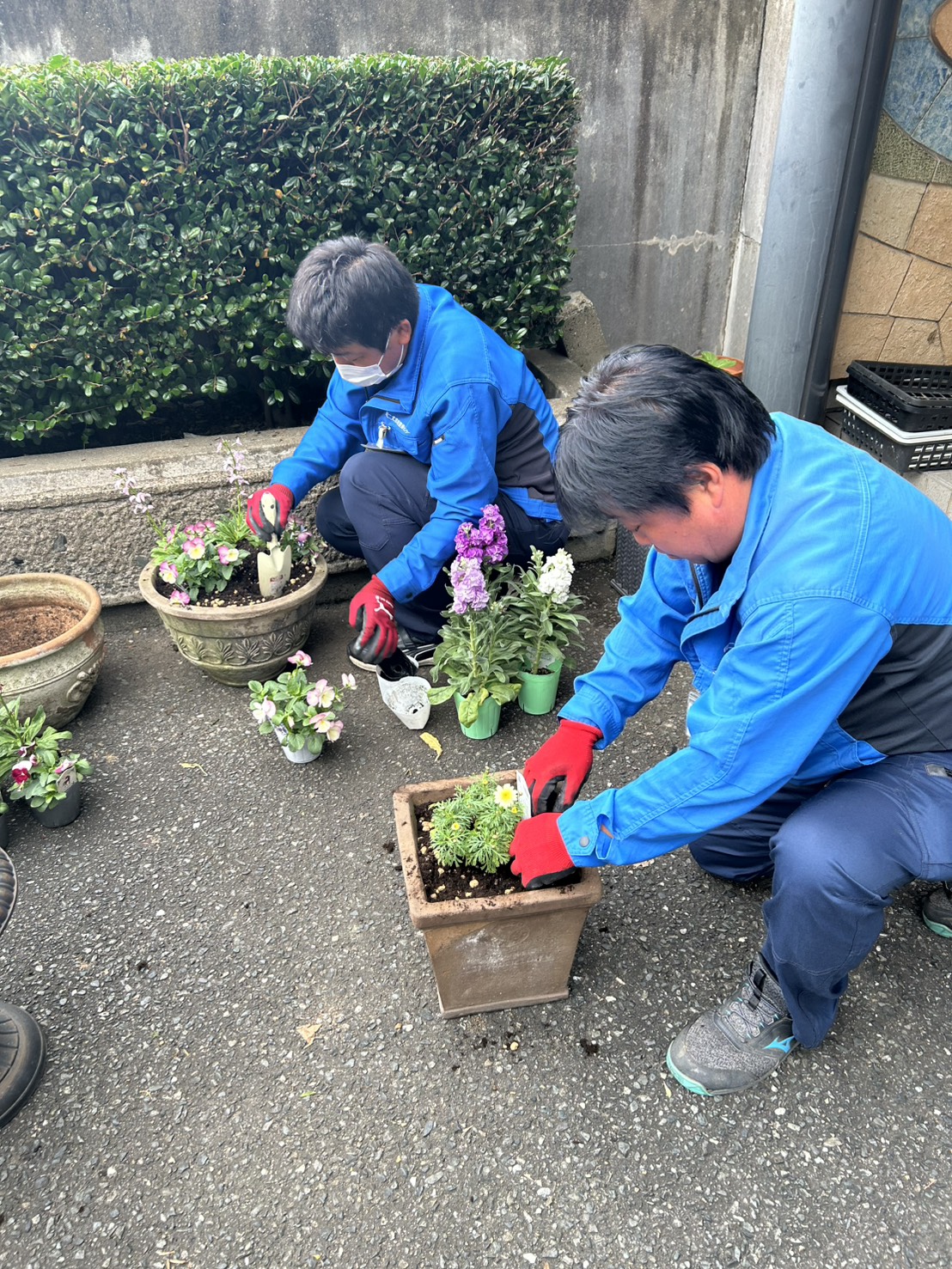 会社の玄関をたくさんのお花で埋め尽くし、少しでも地域の皆様に喜んでいただけたら、そして社員に元気を与え仕事の活力になれば、その思いで日々お花の世話をすることが一番のコツなのかもしれませんね。