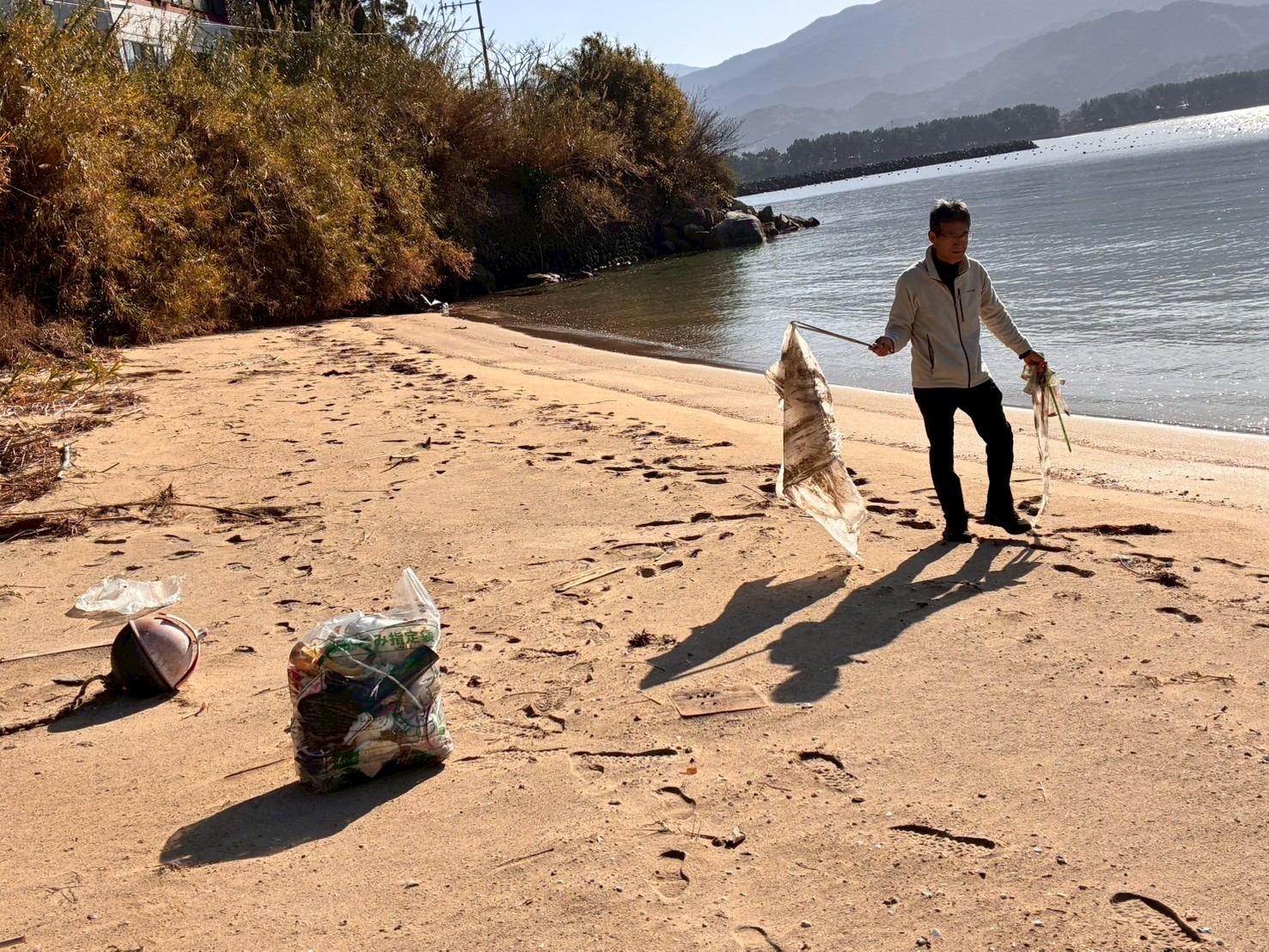 海もいつにもまして穏やかですね。それでも先日までの北西風で波打ち際にはたくさんの漂着ごみが打ち上げられていました。